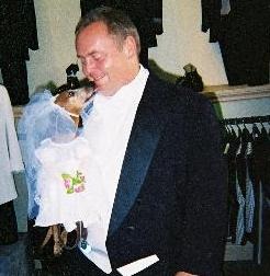 Sadie (Shay Shay or Shay Shay May) was the third doxie in my wife's life and second in mine. As I mentioned earlier, Shay Shay May adopted me immediately. I found the wedding dress a few months before Stef made the mistake of her life, and was bent on surprising her. This picture was taken on the day before our wedding at my final tux fitting. I kid you not, Shay Shay is and was a show stealer. As soon as I picked her up after dressing her in her gown, she planted a sloppy wet one on me. Unfortunately the tux girl caught my last single man's kiss on camera. Shay Shay is the grand dame of our house. She is currently 12 years old. She runs the ranch with an iron paw. In her mature years, she likes to sun and sleep, but still gets excited for romps on the beach.